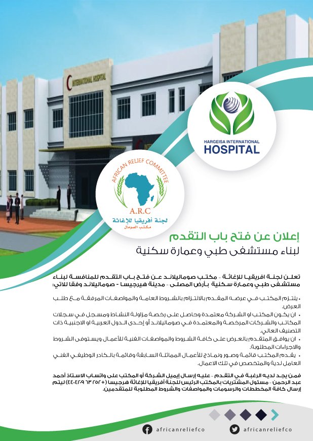 تعلن لجنة افريقيا للإغاثة – مكتب صوماليلاند عن فتح باب التقدم للمنافسة لبناء مستشفى طبي وعمارة سكنية .. بأرض المصلى – مدينة هيرجيسا – صوماليلاند وفقا للاتي : : متطلبات التقديم للعروض يلتزم المكتب في عرضه المقدم بالالتزام بالشروط العامة والمواصفات المرفقة مع طلب العرض. ان يكون المكتب او الشركة معتمدة وحاصل على رخصة مزاولة…